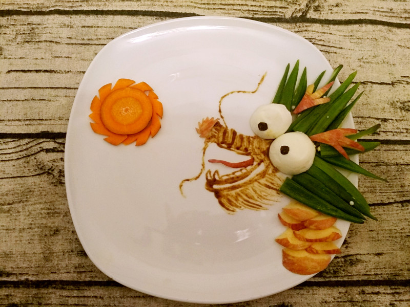 7:再用一些苹果片摆成龙的身体,胡萝卜刻个珠,就完成了