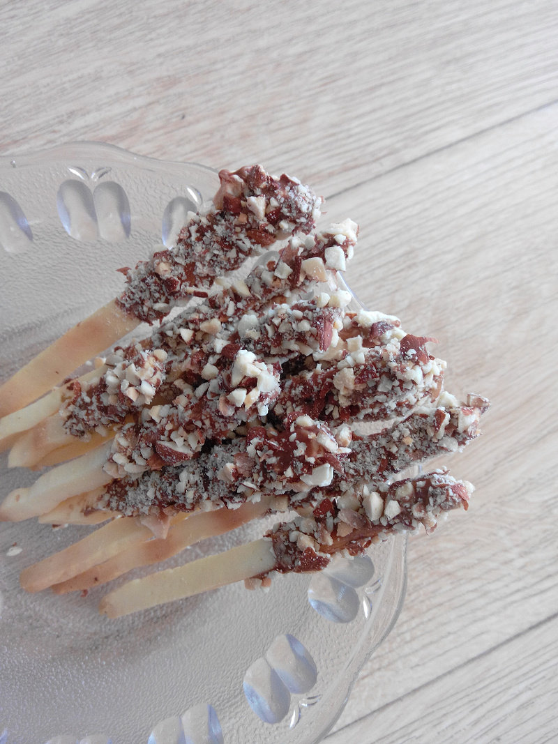 5:巧克力切碎隔水融化成巧克力酱烤熟的饼干沾上巧克力酱再在杏仁碎中滚一下。放入冰箱冷藏酥脆的杏仁饼干就做好啦