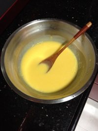 16.将融化后的牛奶倒入芒果泥中搅拌均匀。