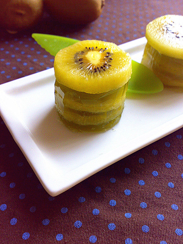 9:把果冻修切成猕猴桃大小,再放一片猕猴桃在上面即可食用
