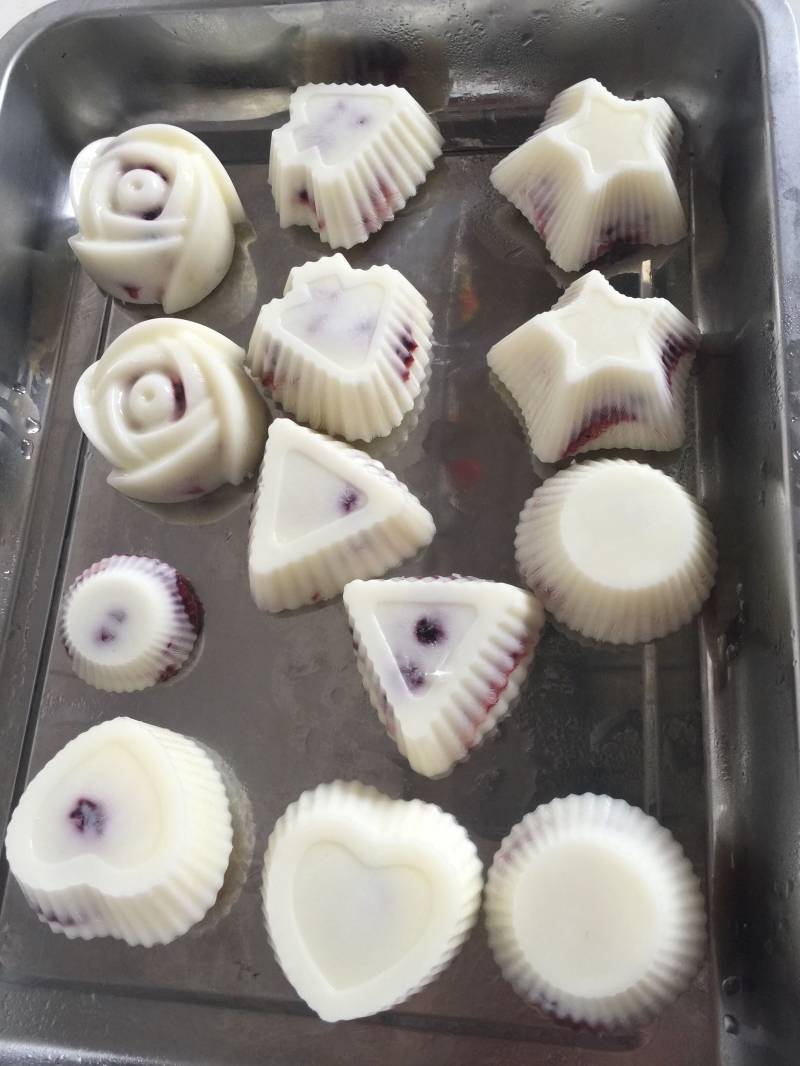 6:在每个硅胶模具中加入一勺蓝莓果酱!