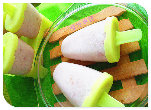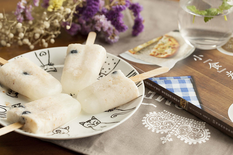4:加入少许荔枝肉,少许蓝莓,倒入冰棍模具中冷冻四小时以上。