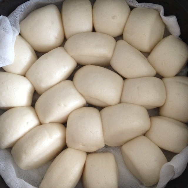 5:笼屉布用水泡透了,把馒头有间距的摆放好,边不要离笼屉太近,否则容易粘锅盖上,不好刷的