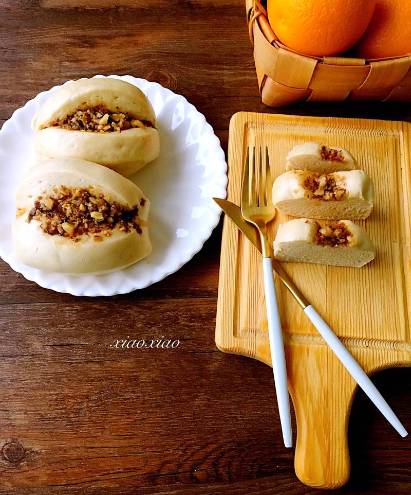 9:发酵好后,把馅料放在切口上。热水下锅文火蒸10分钟,焖5分钟即可。