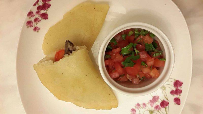 3:玉米粉加凉水加点盐搓成面团,每做一个拿够一个的分量,放在保鲜纸上面的一侧,不要放中间,保鲜纸覆回来盖着面团压扁,