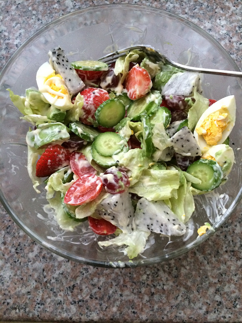 水果黄瓜1条;圣女果几个;生菜2叶;草莓几颗;牛油果1个;无籽提子几颗;火龙果四分之一;水煮鸡蛋2个;