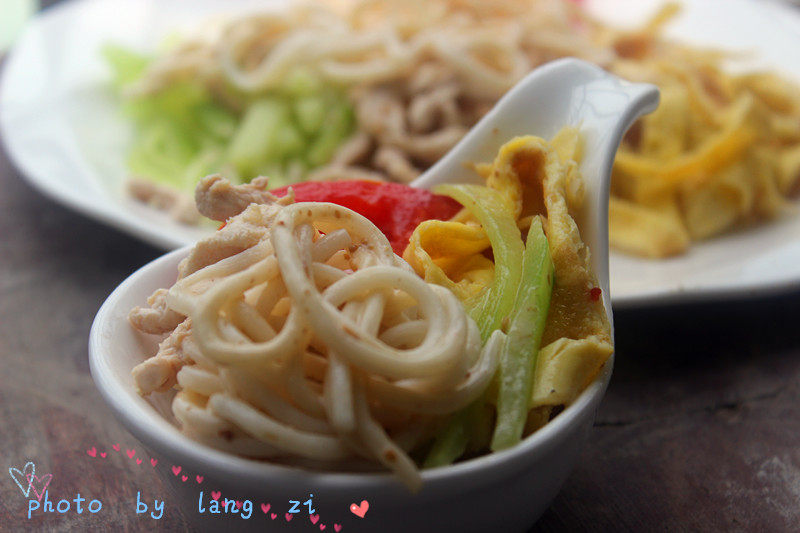 3:黄瓜去皮切丝、西红杮切片、鸡胸肉切丝,蛋皮切丝。
