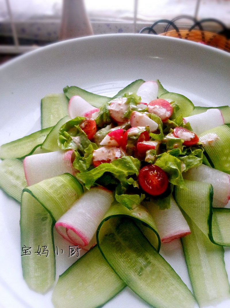 7:黄瓜片和水萝卜卷成如图状,围成一个圆形摆盘,中间圆形的部分放入切好的生菜