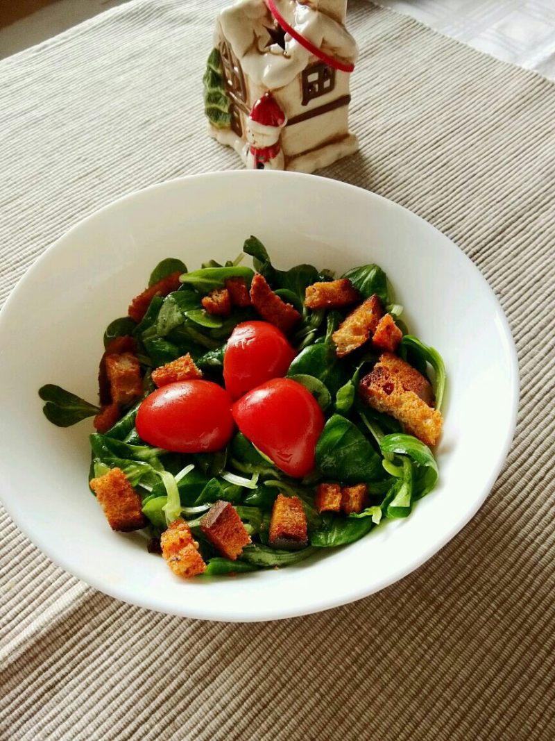 1:原料图:面包丁适量(没有就不放),橄榄油少量(或无味的食用油),野莴苣500克(Feldsalat,或普通的沙拉生菜),小番茄5个,橙子1个。另外:蜂蜜一勺至一勺半(没有蜂蜜,就用白糖代替,保证白糖完全融化即可),盐和胡椒粉适量。