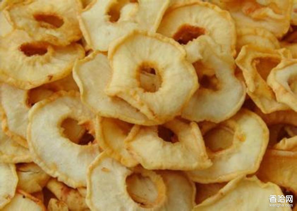 6.成型:将干燥后的梨,用水洗一次;再用硬木擀面杖,在石板上将梨擀成扁圆形,象叶片一样,就成为梨干了。