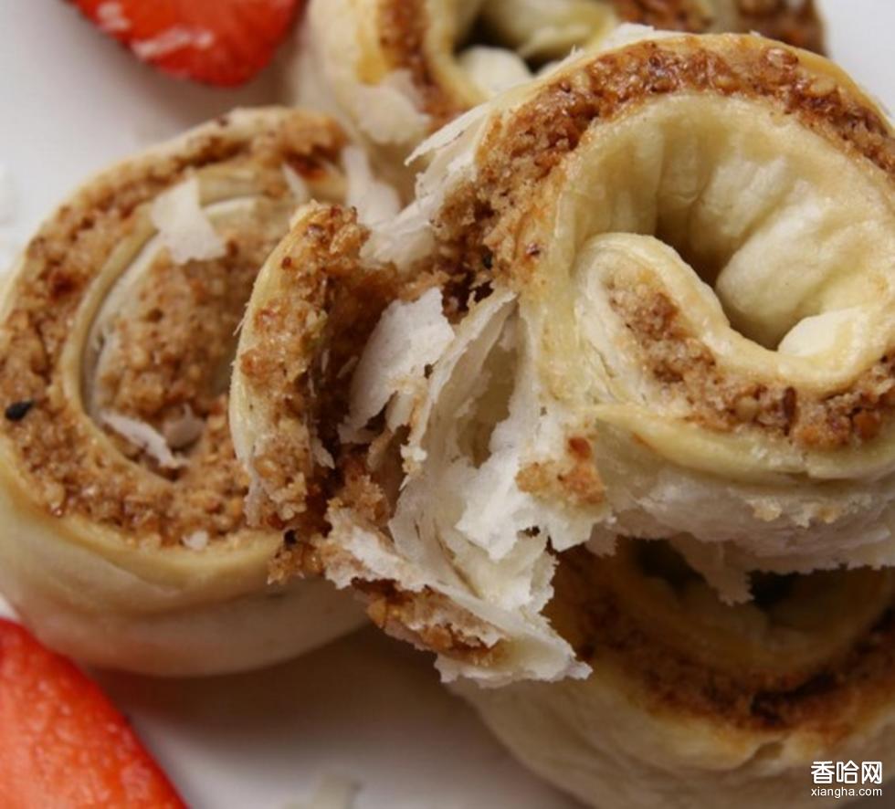 5.烘烤:用中火烘烤,底火略大于上火。待制品馅部突起,呈棕黄色,底面红褐色,即可出炉,冷却后装箱。 质量标准:形态:规格整齐,呈螺旋状,馅料突出,均匀。