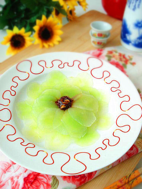 4:倒扣入盘中,摆盘。用小红椒、苹果切片做出玫瑰花装点。
