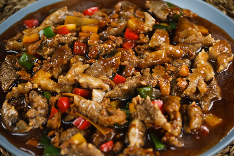 5:下入红椒、黄椒、青椒丁继续翻炒。