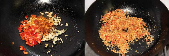 放入辣椒碎和辣椒粉炒出香味,然后放入面包渣和盐炒均匀;