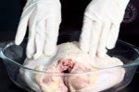 2,按摩鸡身,取一支迷迭香切碎撒在鸡身上,